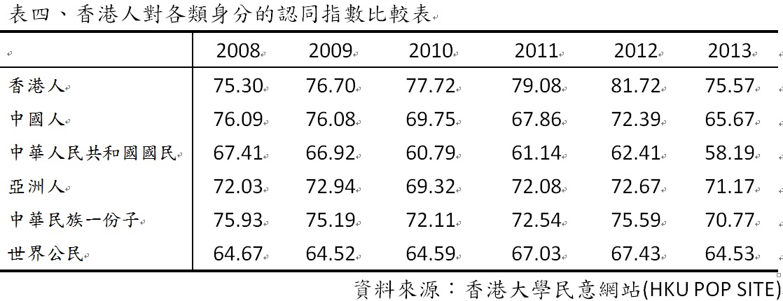 此外,從2008年開始,香港大學就在設計的問卷中調查香港人對各類身分的認同指數,其中包括了「香港人」、「中國人」、「中華人民共和國國民」、「亞洲人」、「中華民族一份子」、「世界公民」等六類。很明顯地,「香港人」這個身份類屬獲得了最高度的認同(歷年調查都在七成五以上),超過「中國人」這個身份類屬的認同。其中認同指數最低的就是「中華人民共和國國民」這個身份類屬,港人竟更願意認同自己是「亞洲人」、「中華民族一份子」或「世界公民」,而不是中華人民共和國的國民(請參閱表四)。上述這些統計數據都在一定程度上說明了香港社會近年來本土意識的抬頭,特別是在香港人和中國人兩種身份的對比選擇中,這樣的傾向就更為凸顯。