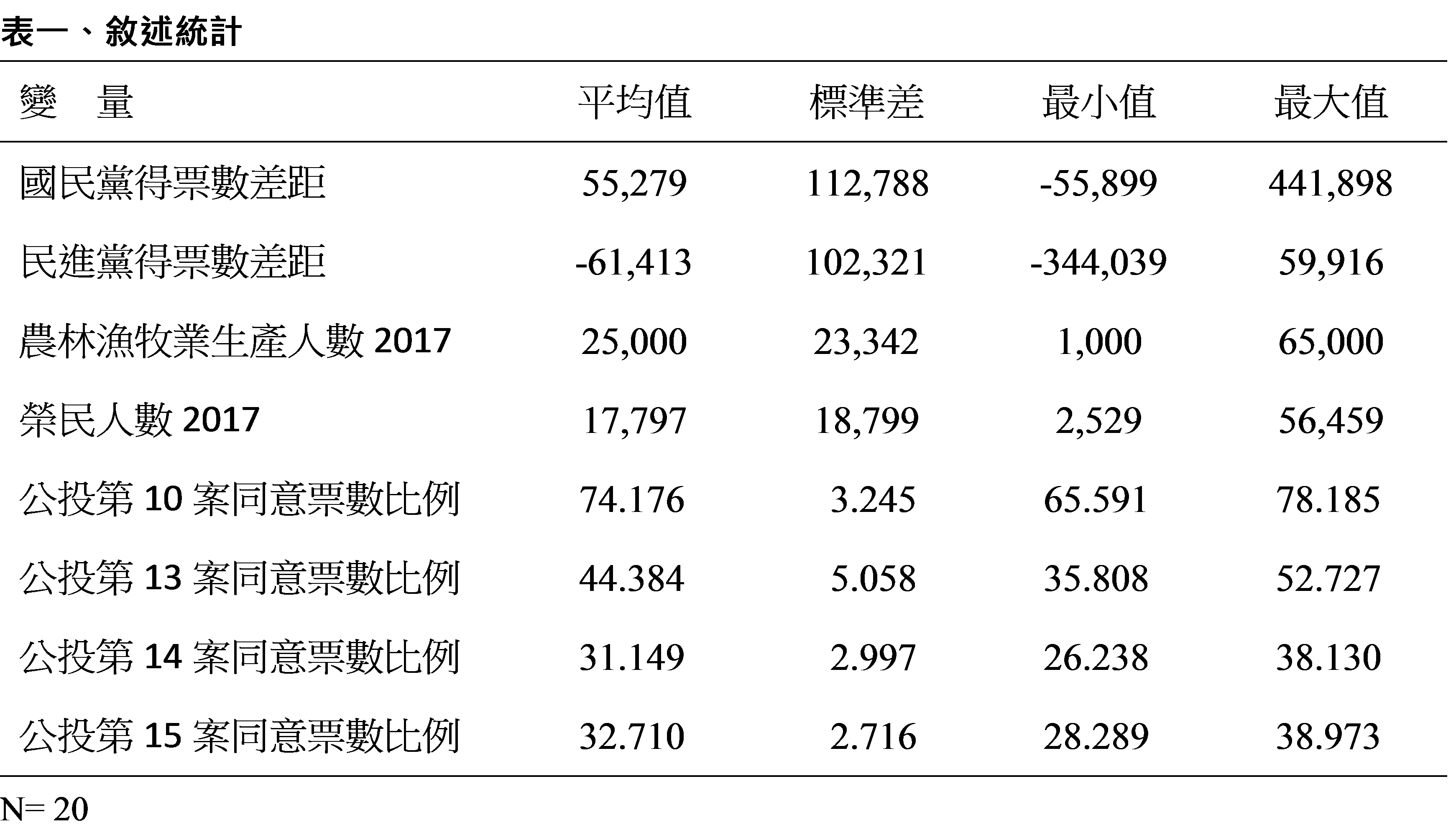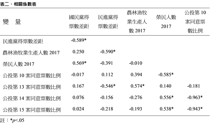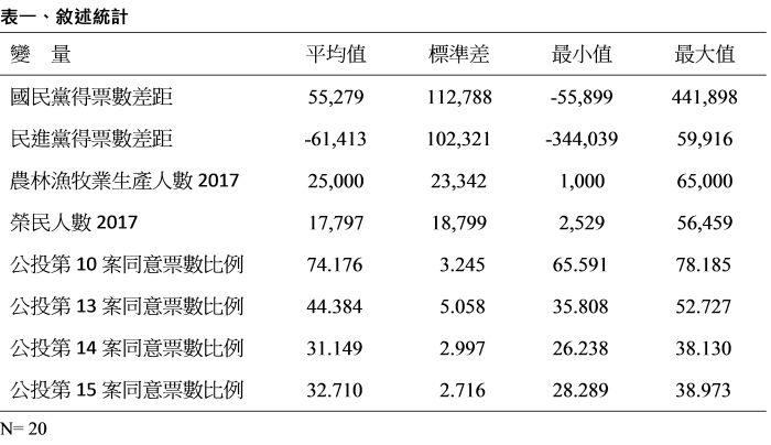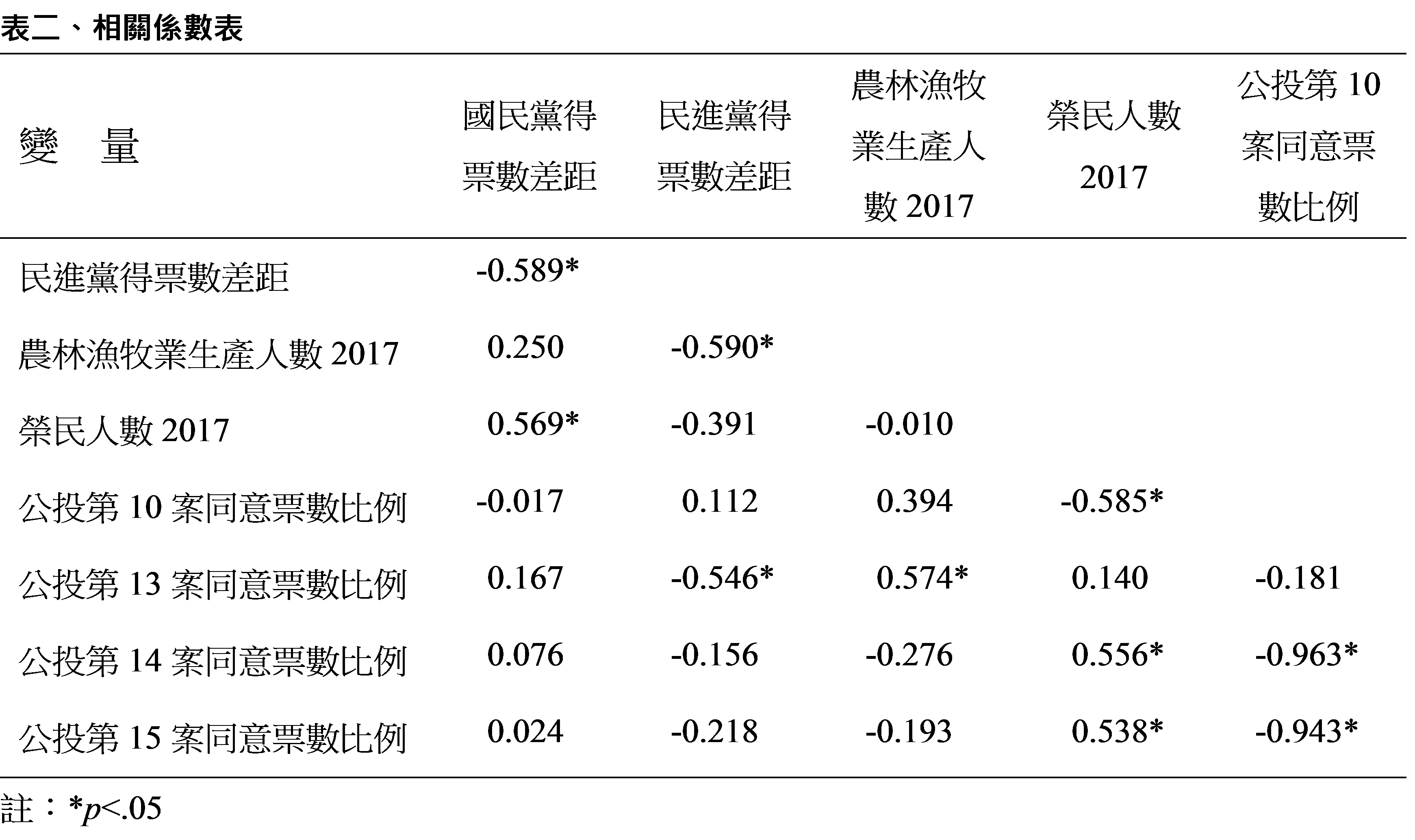 為了更謹慎處理反年改與農業派系動員的效應,我們將 20 個縣市的數據收集整理如上表一,相關係數請見表二,並且將同婚公投的數據納入分析。