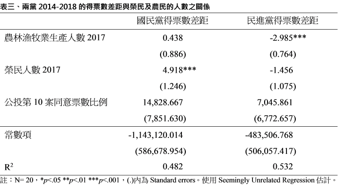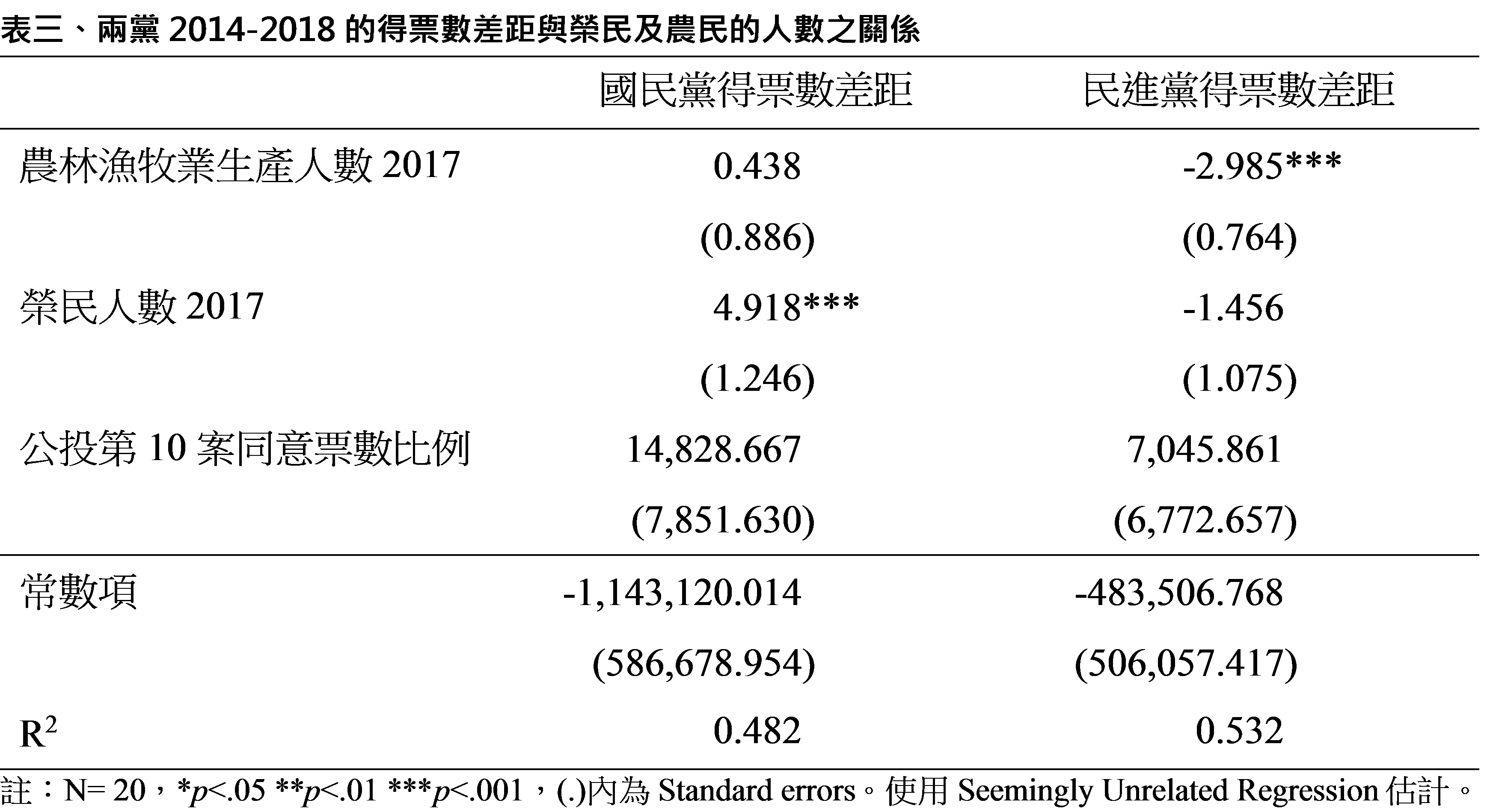 結果如表三所示,在線性迴歸的聯立方程組當中,該縣市一個榮民可以擴大國民黨將近五票(4.918票),請記得他們有 35 萬人,依據 2016 年的社會保險統計恰是軍公教被保險人當中的三分之一,因此也可以解釋為退休軍公教的 105 萬人當中每一人為國民黨拉了 1.6 票;另一方面每個榮民對民進黨減損 1.5 票,但是統計上不顯著,在 50 萬農民方面,其選票雖然未能顯著幫助國民黨,每個農民卻能減少民進黨快 3 票(2.985票)。請注意農民所影響的範圍可能包括農會、漁會、信合社與農牧漁產運銷行業、農田水利會、買賣農舍的房地產業等周邊利益相關機構與派系人口,因此折算下來農民每人並未減到 3 票,可能在 1~2 票之間,但影響仍極大。R-square 高達 0.482 與 0.532 的情況顯示,上述因素可以解釋各縣市得票差距的一半。至於投票率最高的公投第十案(與其他同婚各案高度相關),在兩黨的得票上似對國民黨選票有點邊際顯著提升、但沒有僅減少民進黨的選票。在我們對每個公投案做了多次測試之後,發現只要控制農民與榮民人數,所有的公投案都無法達到影響選情的顯著水準。
