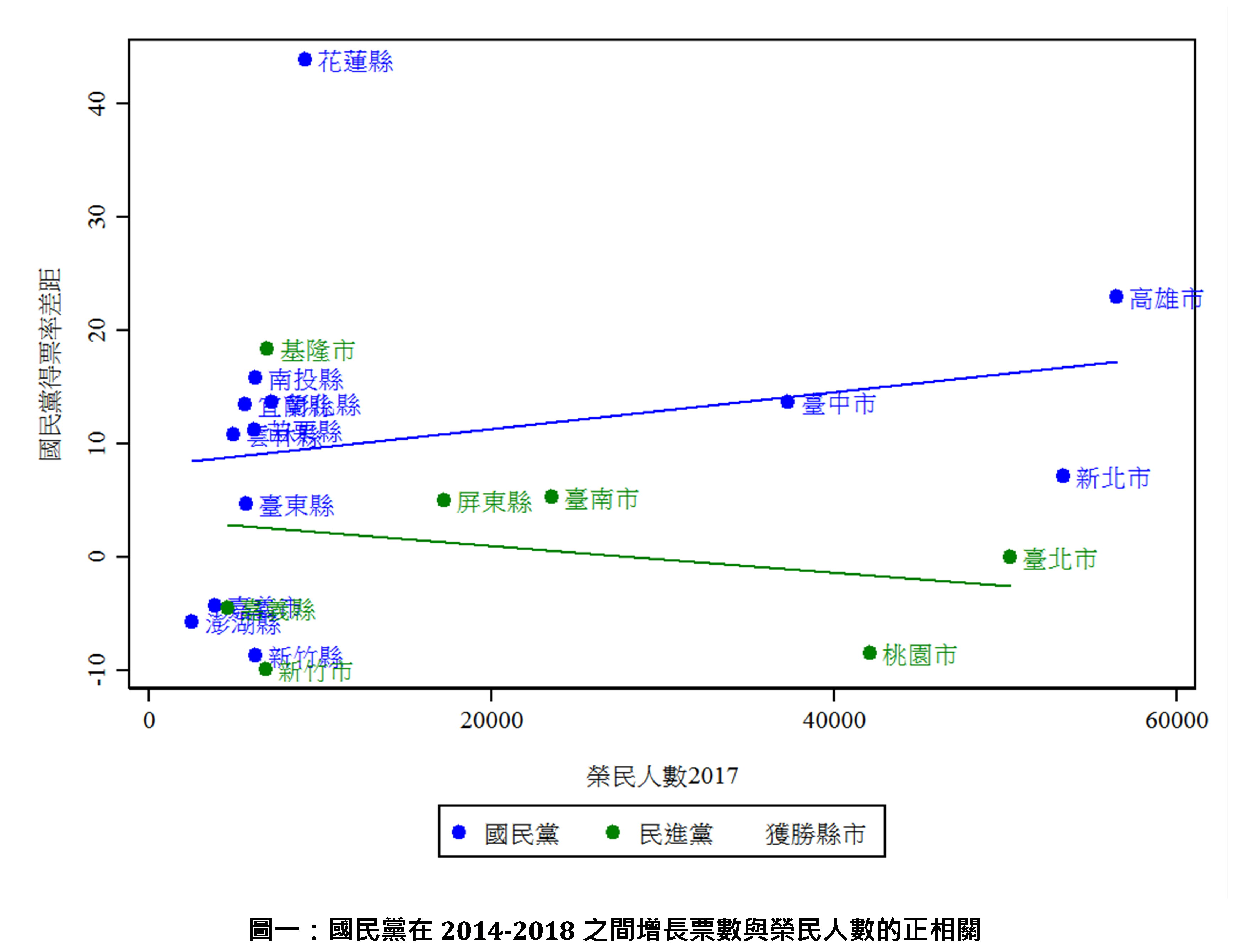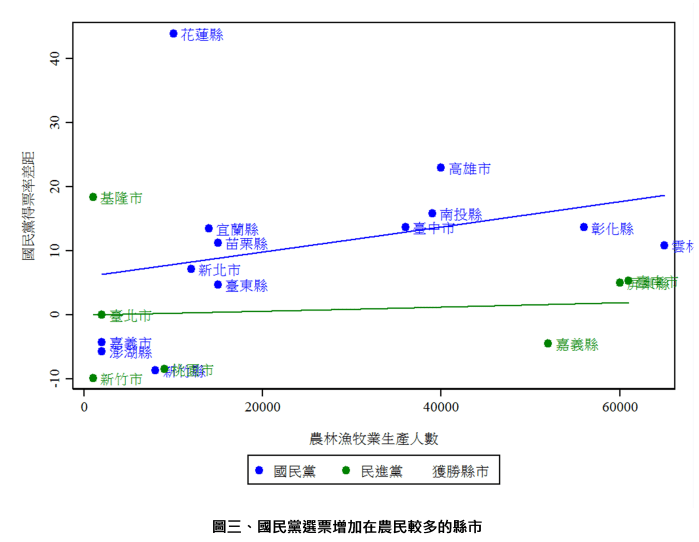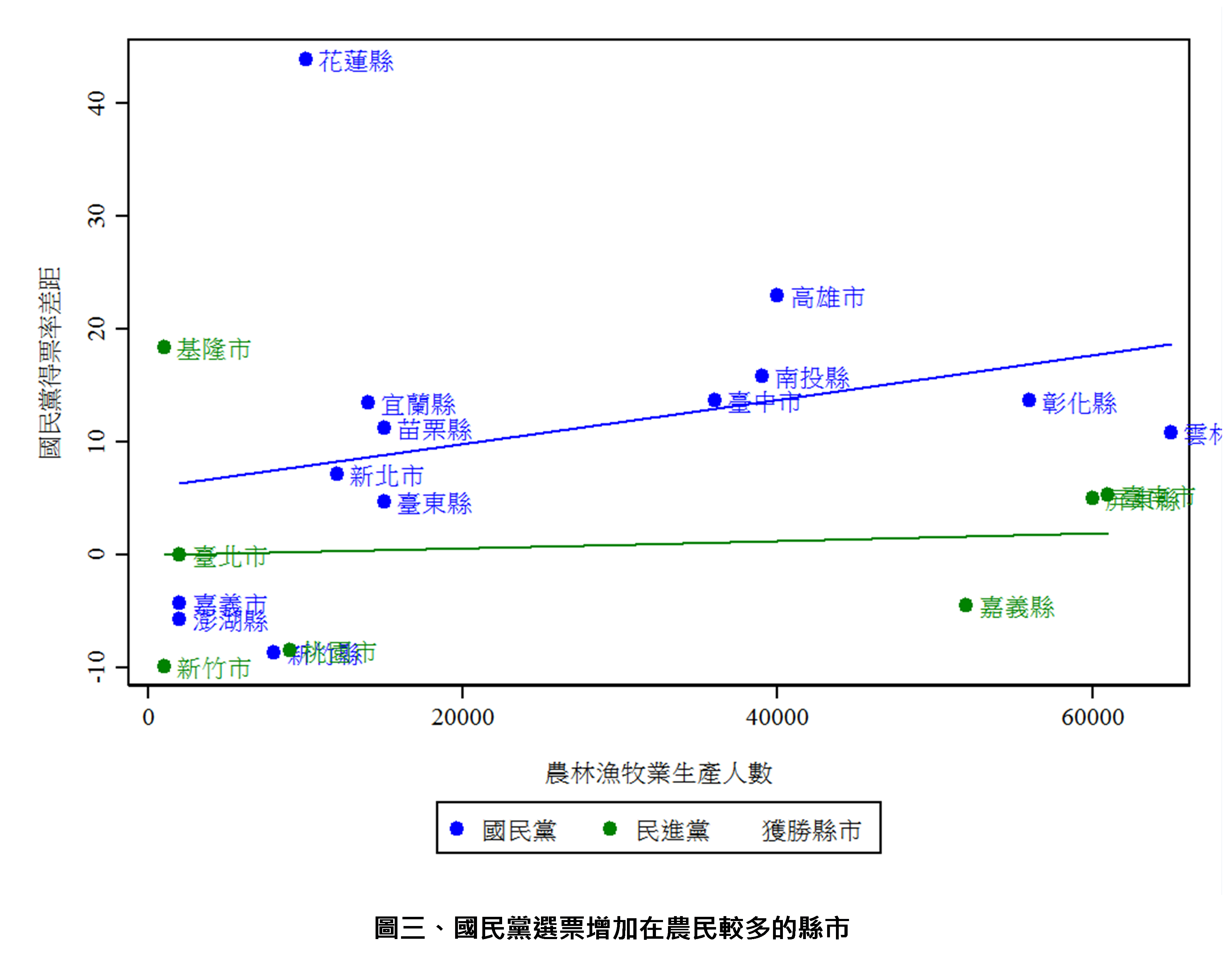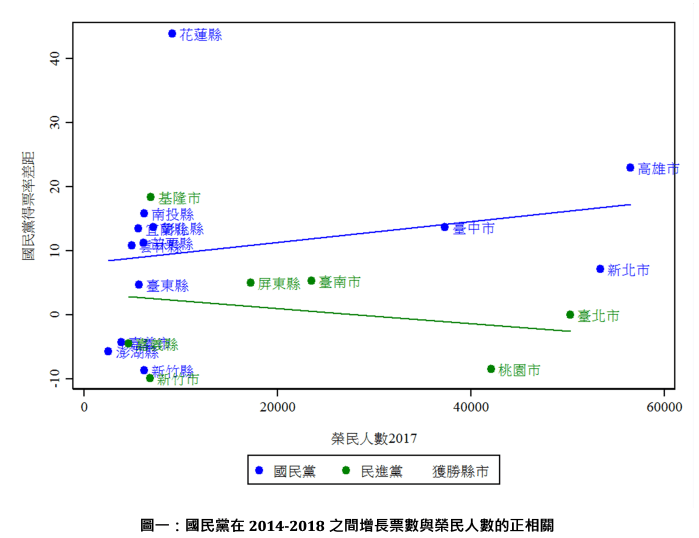如圖一所示,在國民黨大勝的縣市,與榮民人數成相當明顯的正比,然而雙方競爭較強的區域韓流比較有效,使年金改革的不滿者成功動員。圖二顯示榮民人數沒有影響民進黨選民的增減、而是圖一呈現激勵國民黨選民的投票行為。圖三顯示國民黨的選票在農業人口較多的縣市亦有顯著增加,圖四則顯示民進黨在農業人口較多的縣市選票確實有明顯流失。