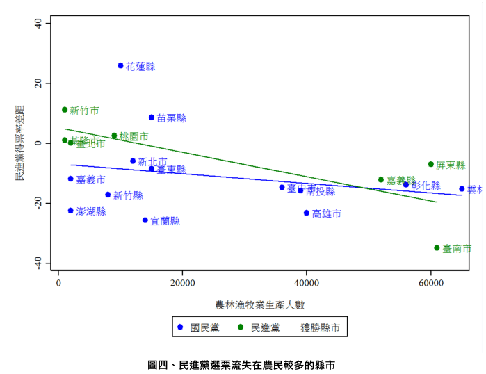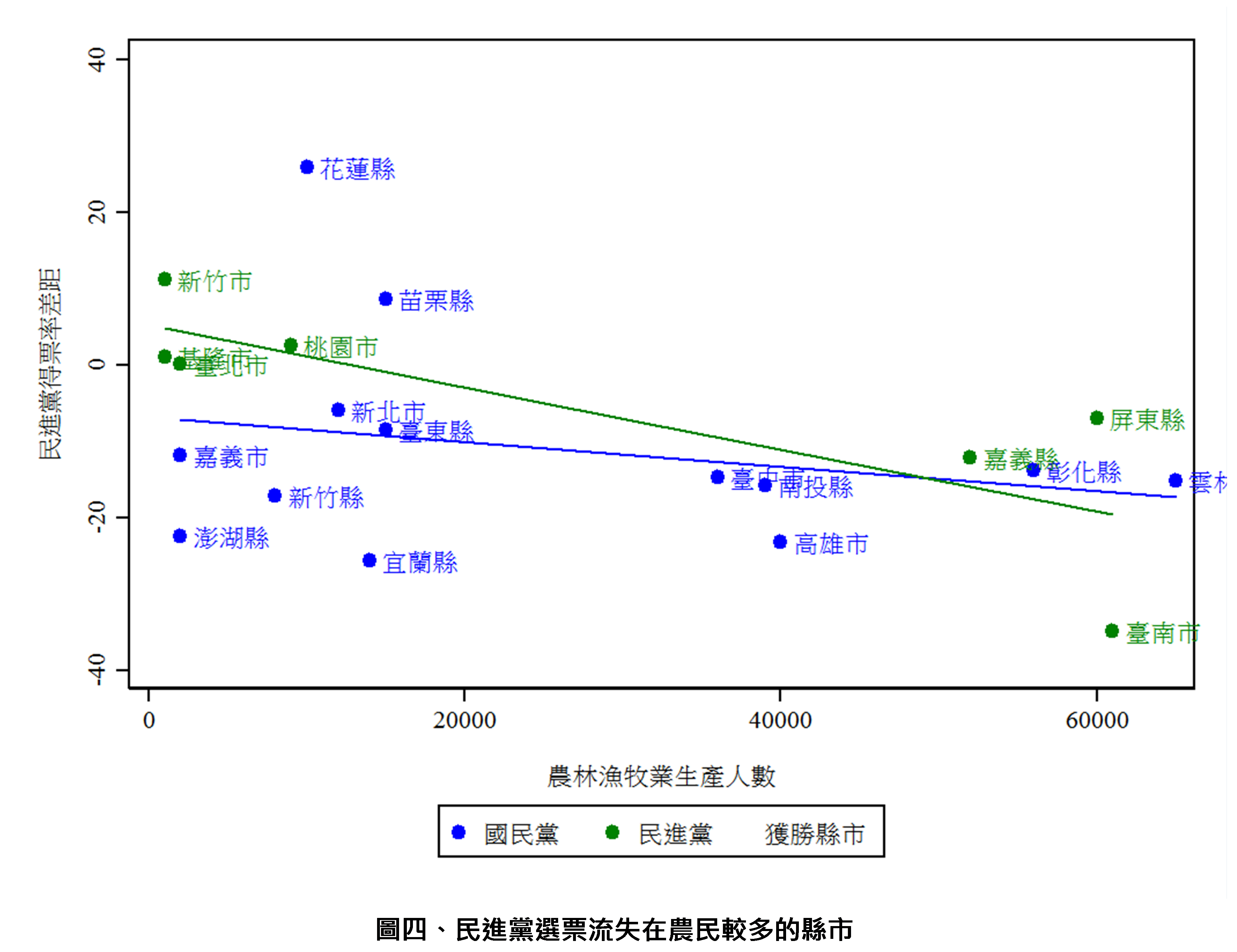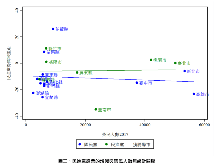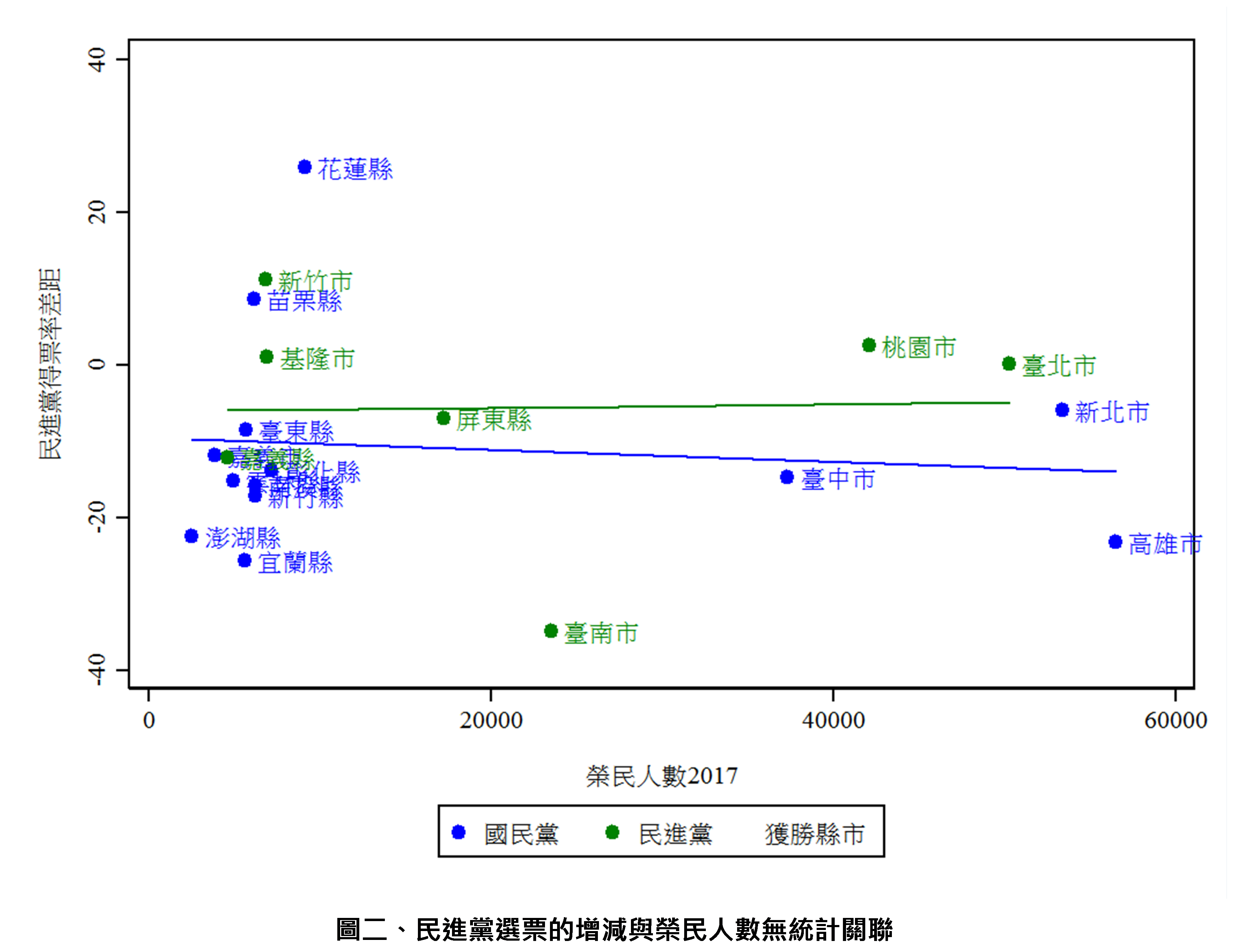 如圖一所示,在國民黨大勝的縣市,與榮民人數成相當明顯的正比,然而雙方競爭較強的區域韓流比較有效,使年金改革的不滿者成功動員。圖二顯示榮民人數沒有影響民進黨選民的增減、而是圖一呈現激勵國民黨選民的投票行為。圖三顯示國民黨的選票在農業人口較多的縣市亦有顯著增加,圖四則顯示民進黨在農業人口較多的縣市選票確實有明顯流失。