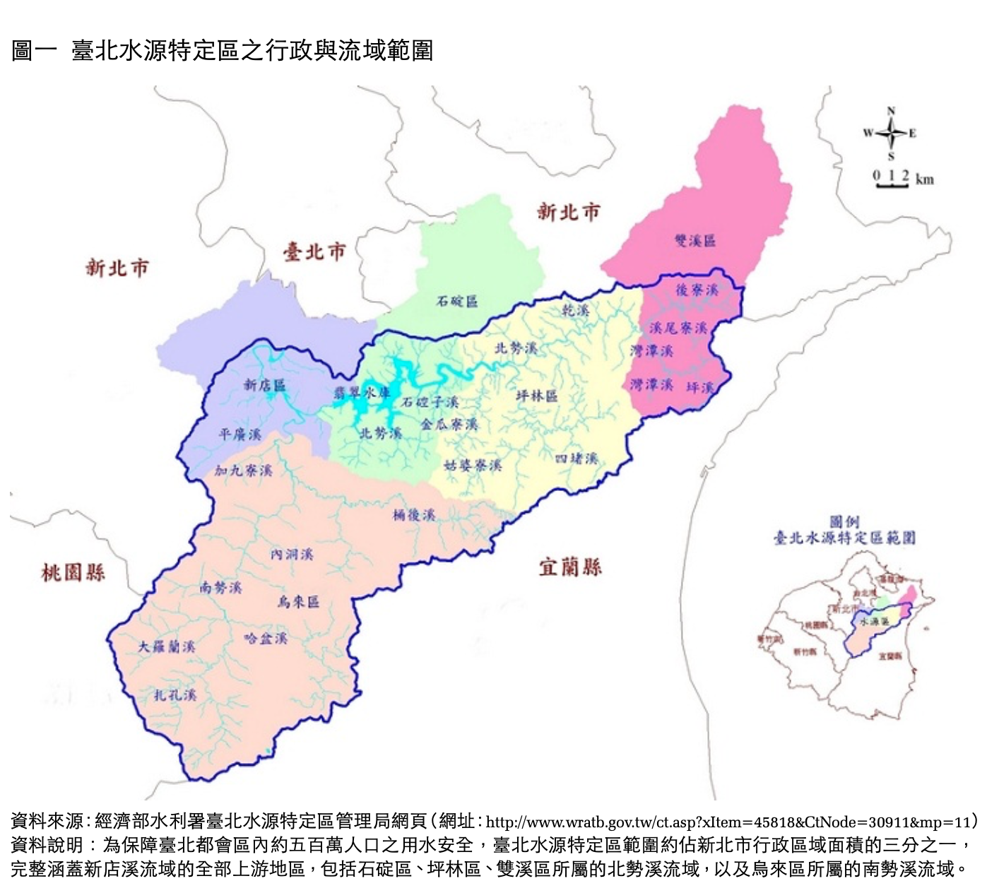 臺北水源特定區曾是臺灣水源管理的最成功案例。它劃設於 1984 年,面積為 69,074.82 公頃,範圍完整涵蓋新店溪流域上游的南、北勢溪兩大流域,亦即新北市新店區、坪林區、石碇區、雙溪區之部分地區,以及烏來區全區(參見圖一)。它不是臺灣最大、也不是最早劃設的水源保護區,但卻是臺灣最重要、而且是唯一一個根據〈都市計畫法〉來劃設、因而能夠實施土地使用分區管制(zoning regulation)的水源保護區。[1] 此外,根據陳恒鈞與黃渾峰(2010)的調查,它也是臺灣森林覆蓋率最高、55 度以上山坡地開發面積最小、土壤沖蝕率最低、且河川水體水質最好的主要集水區。嚴格的土地使用管制,似乎就是臺北水源特定區擁有絕佳水源管理績效的不二因素(周文祥 2014, 陳恒鈞、黃渾峰 2010, 陳肇成 2014)。