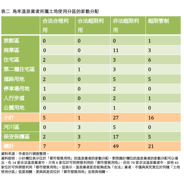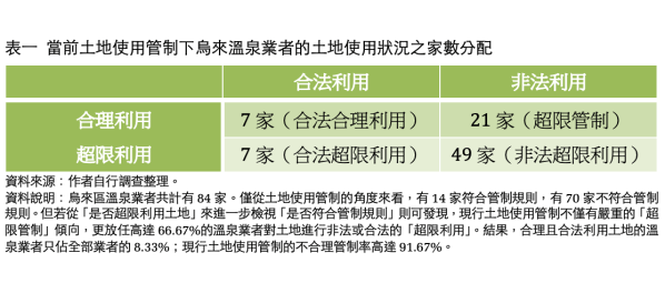 首先,當我們參酌臺灣的土地與建築法規,將是否位於「坡度 30 度以上地區」、「地質敏感地區」、「河川區」等三項固定的地質與地形條件,視為溫泉業者是否超限利用土地的判準,便可清楚看出,在嚴格的土地使用管制下,烏來 14 家合法的溫泉業者中就有 7 家涉及土地「超限利用」,且在 70 家非法的溫泉業者中反而有 21 正遭受到完全不必要也不合理的「超限管制」(參見表一)。這表示,政府就算能夠落實管制,亦即剷除全部非法業者,最多也只能準確剷除 56 家實際超限利用土地的溫泉業者中的 49 家,但卻要連帶剷除掉 28 家合理利用土地的溫泉業者中的 21 家。