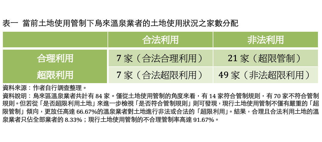 為瞭解臺北水源特定區土地使用管制失靈的原因,我們於是在連續風災過後針對烏來區內 84 家溫泉業者的土地使用狀況展開清查。我們清查後發現,政府放任高達 70 家非法溫泉業者長期經營溫泉旅館業,確實是讓嚴格的土地使用管制形同虛設的重要因素。不過我們還發現,並非所有非法的溫泉業者都有超限利用土地的情形,也不是所有合法的溫泉業者都沒有超限利用土地的情形。這表示,一味落實當前的土地使用管制措施,勢將無助於遏止、反而有可能強化區內溫泉業者的土地超限利用行為。