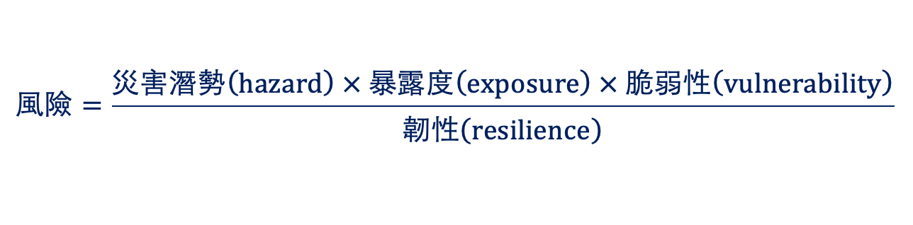 也就是說,災難風險的總合,至少受到下列四組因素影響: