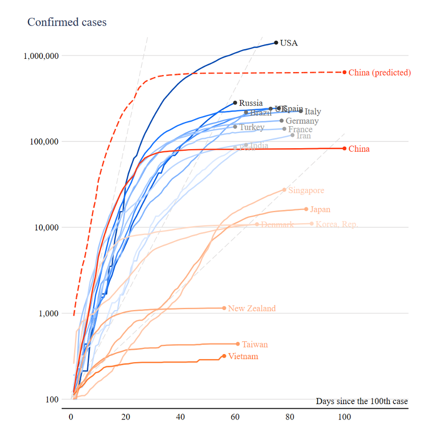 圖1:全球各主要國家的累積感染人數之對數,從第一百例開始算的天數(5/17)[3]