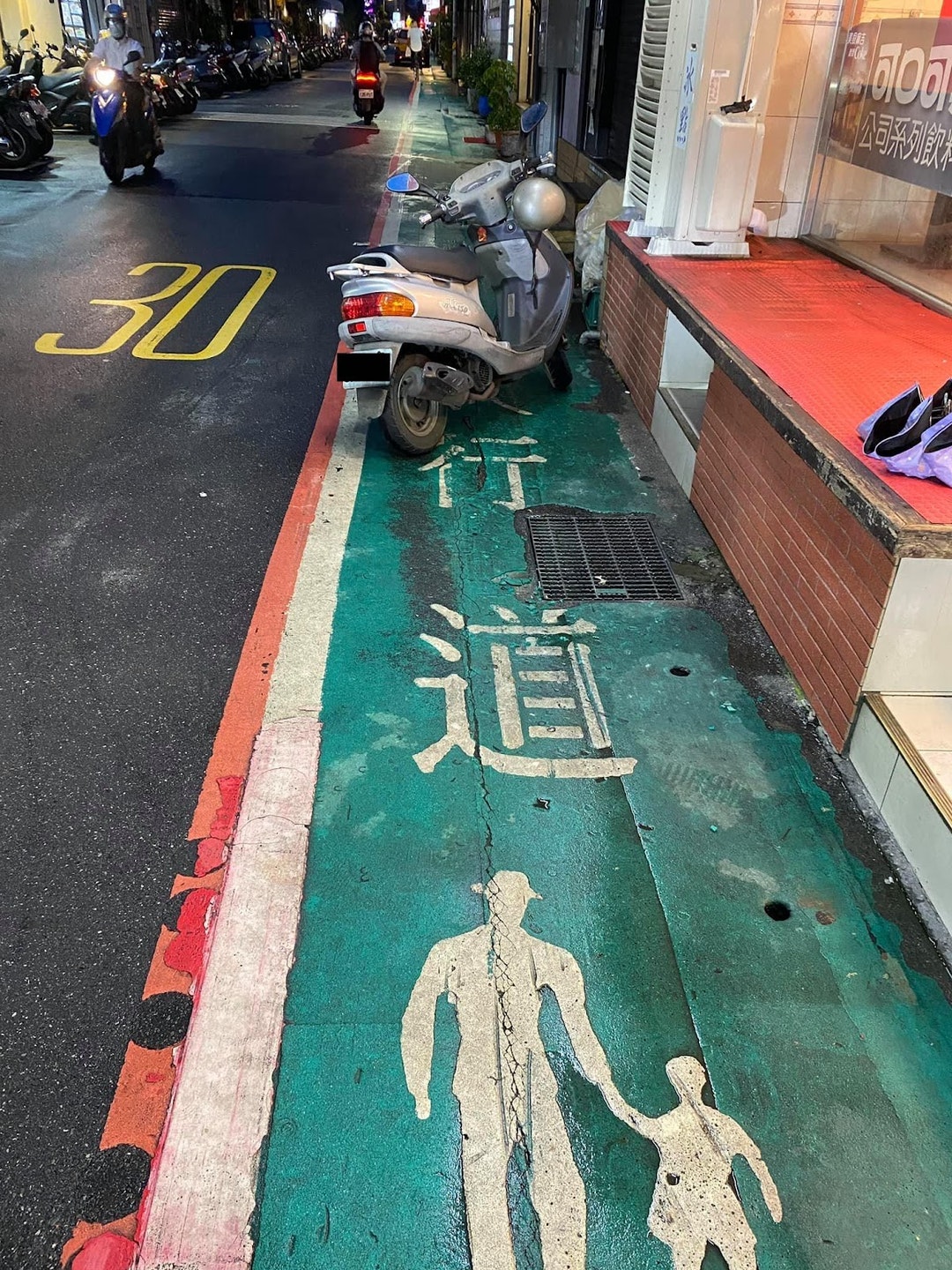 台灣的人行道有許多是「標線型人行道」,在道路邊緣畫一條線,漆上綠色油漆,上面寫著「人行道」。我也很常使用「標線型人行道」,但只是沿著一條沒有保護的路肩行走,並沒有在「人行道」行走的感覺。車輛會在我的身旁呼嘯而去,甚至可以看到車輛在人行道上通行的景象。實際上,很難說這種「標線型人行道」有起到人行道的作用,甚至,人行道可能已淪為汽機車的免費停車位。