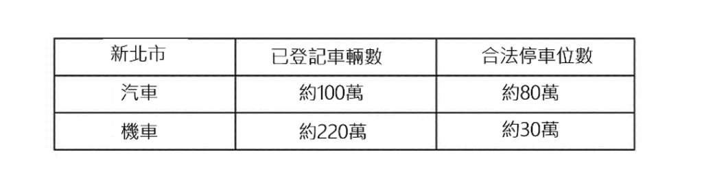 以新北市為例,約有100萬輛已登記的汽車,但合法停車位卻只有80萬個。 機車的情況更糟糕,已登記的機車約有220 萬台,而合法停車位只有30萬個。 再者,台灣也沒有像日本的《車庫法》,買車時也不需要證明擁有停車位。