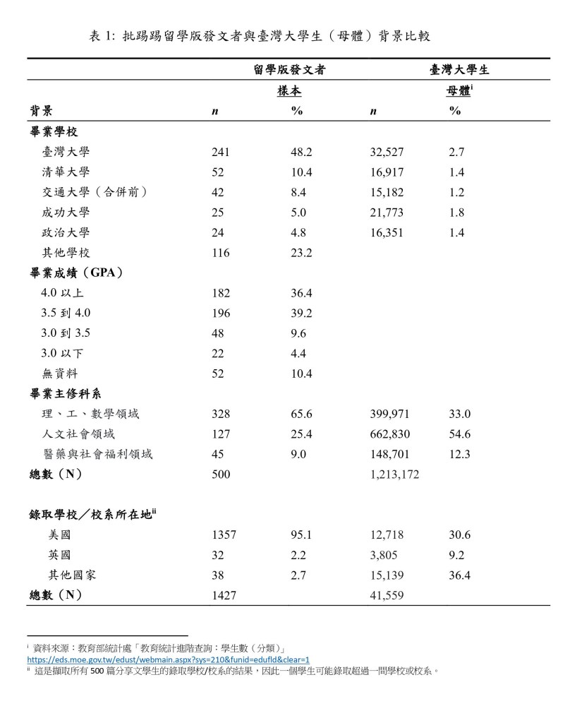 之所以選擇這樣的樣本,是基於兩項假設。第一,研究團隊認為雖然留學版中有其他的資訊與意見交換(如租屋、在地學生會等),但根本上仍是一個以分享留學與錄取資訊為主的平台,因此錄取與分享文可以在批踢踢留學版中獲得最多的關注。其次,由於這些「錄取」與「分享」的文章,多半是錄取者進行的分享,因此在版上擁有一定的權威性,也很可能會實質影響版上學生或申請者的行動。研究者並非宣稱這500人「樣本」代表整個批踢踢留學版,而是以500人代表在批踢踢留學版中較具備影響力的群體。