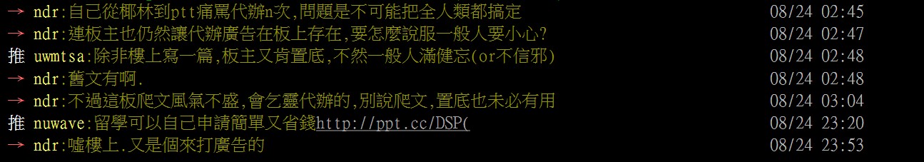 因此,留學版似乎對於「留學代辦」印象不佳,並且普遍認為那是「非菁英」的學生用來「逃避努力」才購買的服務。版中的討論多半將留學代辦視為可以輕易被取代的服務。「自己辦?很難?」或是「填個資料有啥好代辦的?」這類的描述,呈現了一種不被菁英學生青睞的留學市場。
