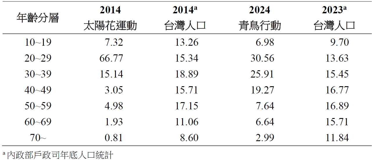 「青鳥」運動現場的調查速寫(以下簡稱前文)[2]刊登後,引發各界關注及討論。調查小組在5月28日的第三次集會中,再度根據前文的系統抽樣,收集到新一批面訪問卷,經統整所有資料後進行了更多面向的比較,也藉此回應一些討論。本文首先與2014年太陽花運動調查對照,呈現參與者的年齡分層比較;其次,與台灣社會變遷基本調查(TSCS)、台灣選舉與民主化調查(TEDS)、台灣傳播調查(TCS)資料進行橫向比較,包含「資訊管道」、「政治極化與討論」及「民主價值觀」等主題的觀察,試圖描繪並展現「青鳥」參與者的多元樣貌。