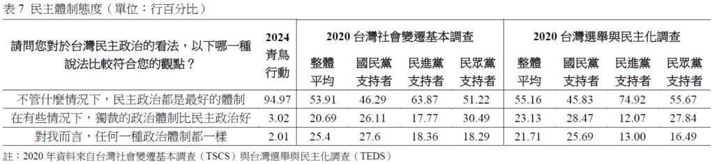 雖然有極高的比例認為「不管在什麼情況下,民主政治都是最好的體制」,但其參與者對於「民主政治、獨裁」內涵的解釋與民進黨、民眾黨、國民黨都不一定相同。