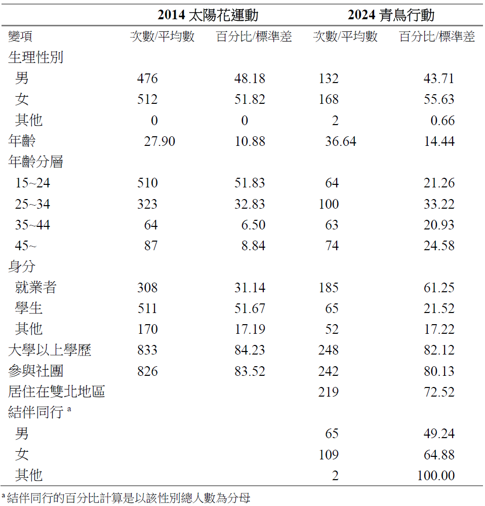 1.人口圖像部分,青鳥行動者參與者中,女性約佔 55% 、具有學生身份者比例僅 21.52%,平均年齡則是 36.6 歲。但年齡的分布並非十年前參與者的平移,而是在 20-29 歲以外的各年齡層皆有增加比例,有著更多元的人口組成。