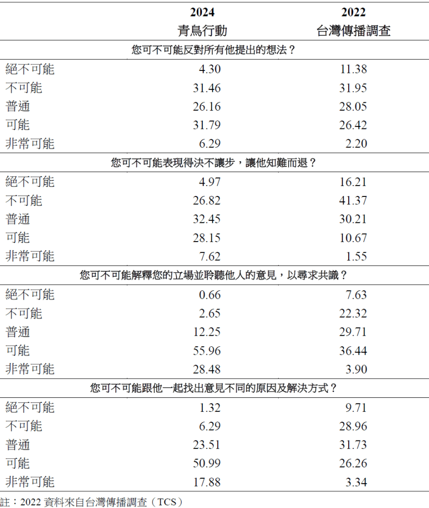 關於不同政治意見者的「異溫層溝通」,我們可以與 2022 年台灣傳播調查進行更多比較,請見表5。本次調查也參考了其中關於政治極化傾向的題組,直接詢問受訪者在「面對與政治上意見不同的人」,會對那個人有怎樣的應對態度。由表5可見,青鳥行動的參與者相較於整體台灣社會,更有可能表現得決不讓步。但他們又同時更願意解釋自己的立場尋求共識、找出不同意見的原因與解決方式。這些題組之間的態度差異,很難斷言青鳥行動參與者,到底是否願意與不同政治意見的對象溝通、還是不願溝通。