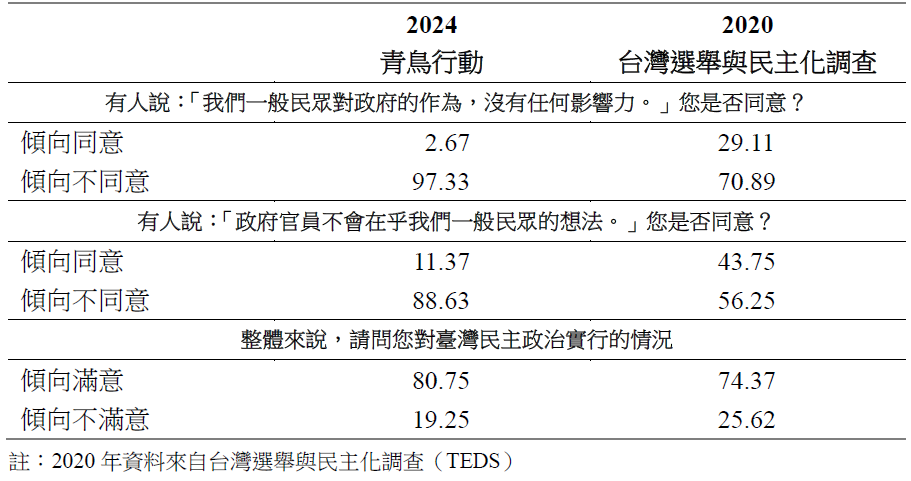 實際上,本研究的「民主價值觀」問卷已指出,青鳥運動參與者所理解的民主觀念與各政黨有相當大的差異。既然如此,單純用「對於台灣民主政治的看法….」、「民主/獨裁」的問卷問題與選項設計,能否真正表現出青鳥運動參與者、不同政黨的「民主體制態度」,值得懷疑。