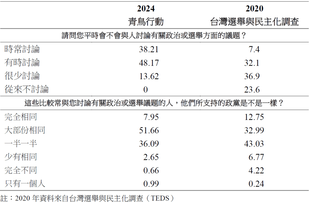 在參與運動的資訊管道之外,我們也詢問受訪者平時是否與他人討論有關政治或選舉方面的議題,請見表4。首先,青鳥行動參與者相較於整體台灣社會(以2020年TEDS抽樣調查為比較基準),更常與他人討論政治。而這些與受訪者討論政治的對象當中,雖然有「大部分相同」的支持政黨,但「完全相同」的情形比 TEDS 的受訪者來得較少。這一部分是否與「同溫層」或「回聲室效應」等現象有關,也是相當值得以訪談方法深究的議題:這些積極社運參與者,如何分配「同溫層取暖」或「異溫層溝通」的情形?我們也試圖從另一個角度切入討論。