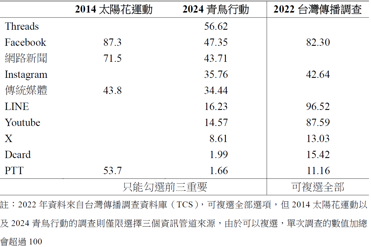 那麼,當前台灣社會慣用的平台又是哪些?可參考台灣傳播調查在 2022 年抽樣詢問全台受訪者在數位平台媒體使用情況的結果(表3右),其實 LINE、Youtube、Facebook 還是台灣最多使用者的數位平台(必須留意的是,台灣傳播調查讓受訪者可以全部複選這些選項,但是 2014 年的太陽花靜坐者調查以及本次調查 2024 青鳥行動參與者則僅限選擇三個資訊管道來源,有明顯的不同)。