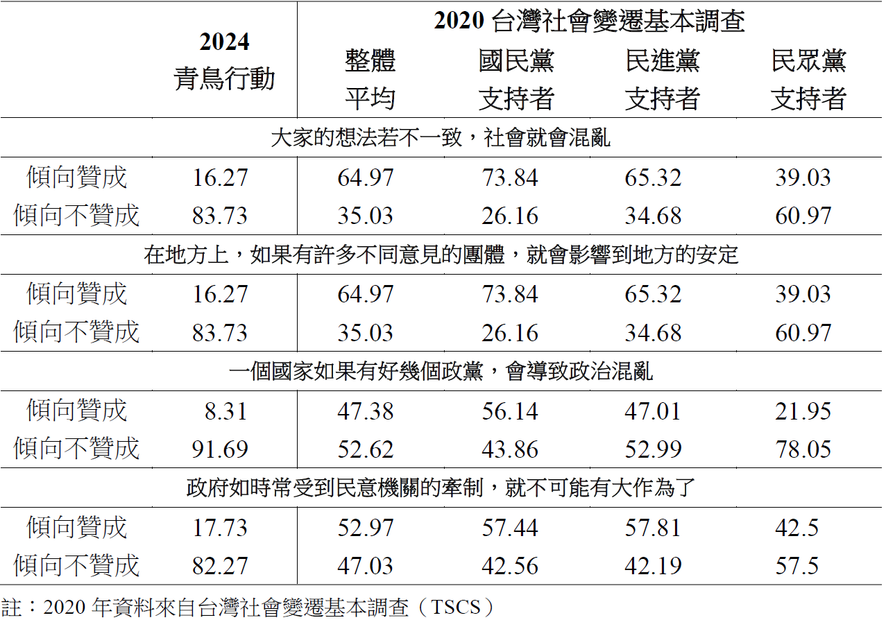 雖然一些批評試圖將這場運動的參與者等同於特定政黨的支持者,然而,本次調查比對台灣社會變遷基本調查,在表6中顯示相較於 2020 年的國民黨、民進黨、民眾黨支持者或者整體的平均偏好,青鳥行動的參與者在民主價值觀念確實是相對偏向多元、多黨以及權力制衡的群體。反倒呈現這群 2024 年出現在立院周遭的參與者,明顯比任何一黨的支持者具有更偏向自由派的民主價值態度。