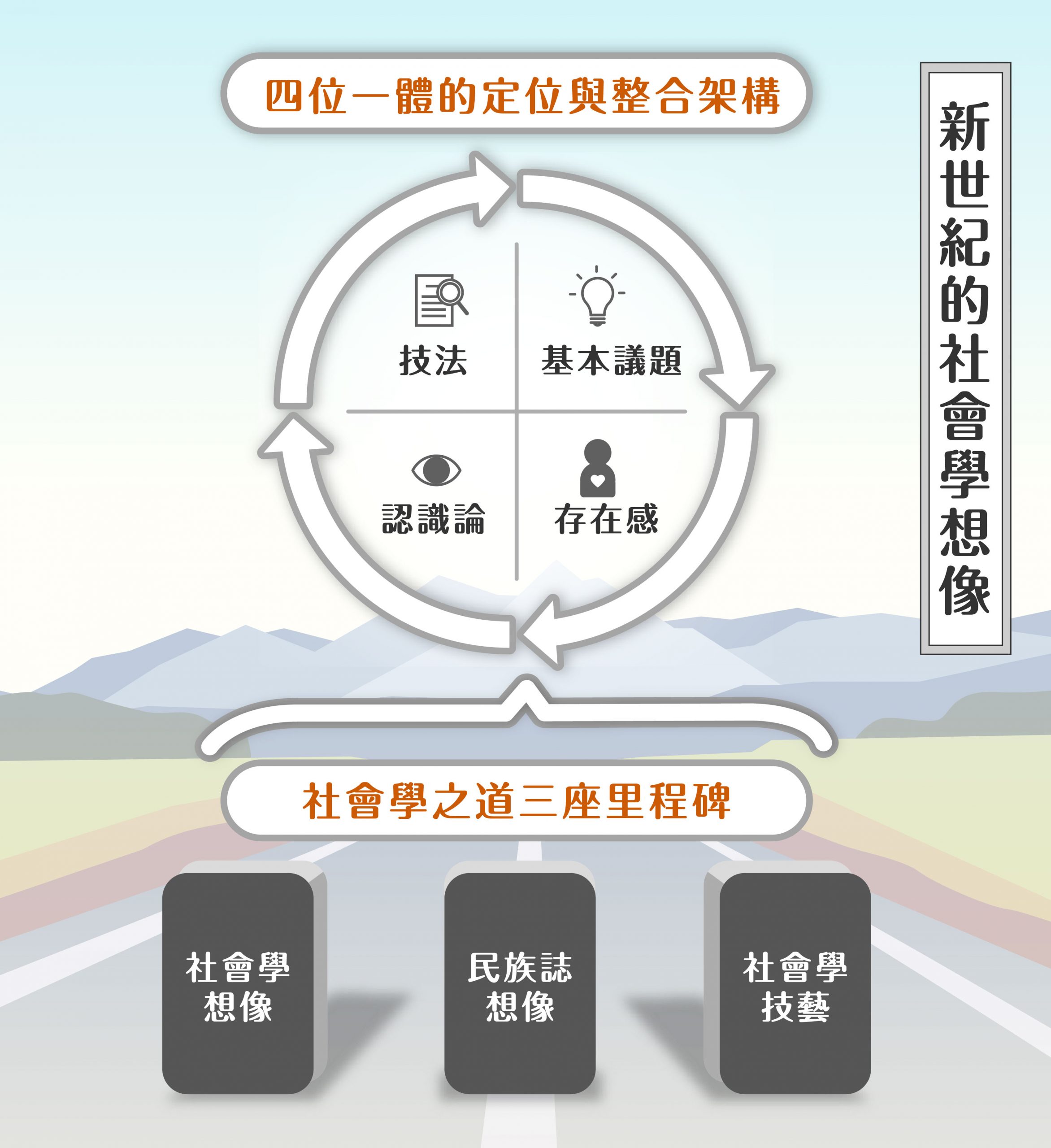 「四位一體」的社會學之道強調「存在感」──研究者為何從事研究?研究背後的終極關懷為何?此外,還包括研究所採用的「技法」、欲探索的「基本議題」,以及如何建構研究對象的「認識論」,四者在實作上緊密相連、彼此呼應。