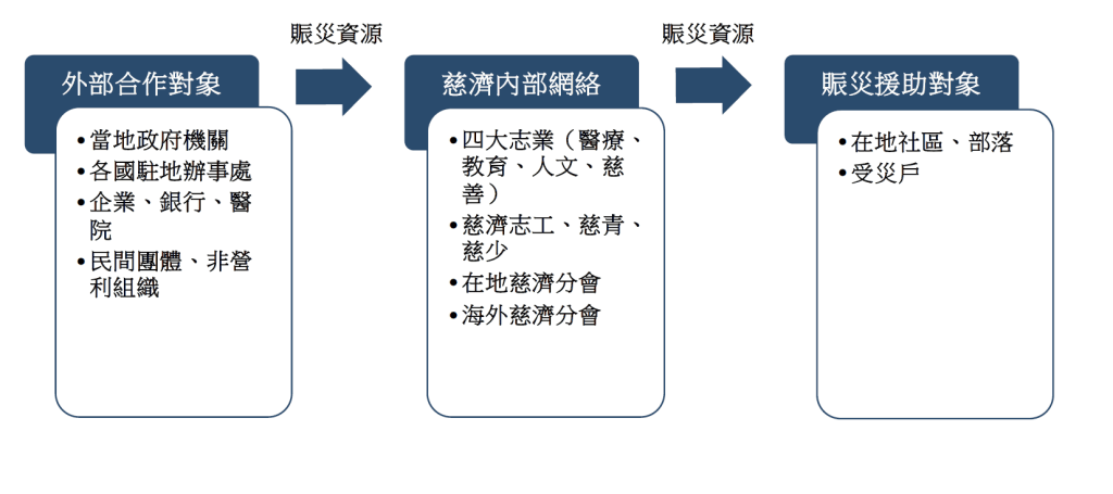 下圖呈現慈濟的國際賑災網絡,涵蓋內部組織資源與外部合作夥伴。透過這一協力合作的網絡,慈濟能夠有效整合外界資源,迅速將援助送抵受災地區。同時,慈濟在國際賑災工作的參與,亦促使其進一步累積國際聲譽與網絡資源。這些聲譽與網絡資源,使慈濟得以進入國際重要組織與會議,分享自身的賑災經驗與人道理念。例如,慈濟已獲聯合國轄下多個組織的觀察員資格,並受邀參與氣候變遷峰會、婦女大會等全球性會議,深化其在國際人道領域的貢獻。這也說明,慈濟能夠從一個臺灣在地慈善團體,發展為國際知名的非政府組織,其在國際賑災行動累積的經驗與全球網絡夥伴的建立,乃是重要的因素。